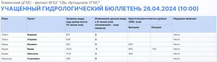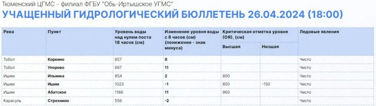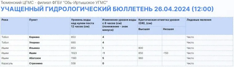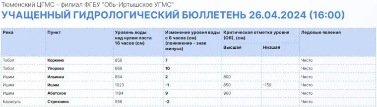 Уровень воды в реках Тюменской области на 10 часов 26 апреля