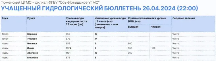 «Село Абатское, река Ишим. По данным гидропоста, на 22:00 26 апреля уровень воды составил 1191 сантиметр», — рассказали в гидрометеоцентре. С 08:00 до 22:00 вода прибыла на 16 сантиметров.