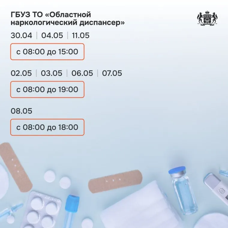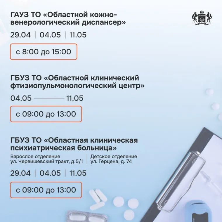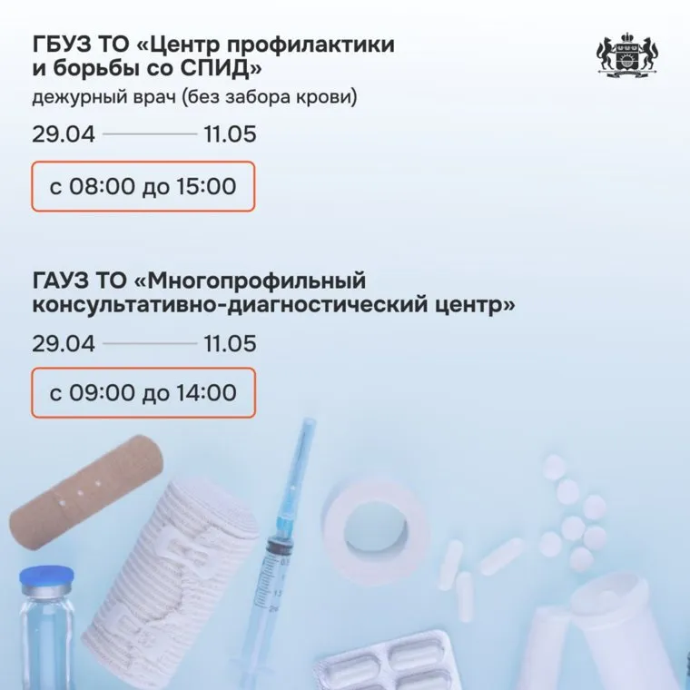 « В праздничные дни в медицинских учреждениях продолжится прием пациентов. При этом график работы медучреждений Тюменской области с 28 апреля по 1 мая и с 9 по 12 мая изменится», — рассказали URA.RU в депздраве.