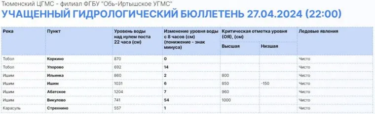 «Уровень воды в реке Ишим по состоянию на 22:00 27 апреля составляет 1204 сантиметра. За сутки прирост — 7 см. За последние два часа уровень поднялся на один сантиметр», — сообщается в telegram-канале информационного центра правительства Тюменской области.