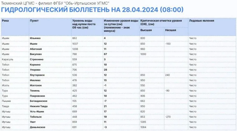На 8:00 (6:00 по мск) уровень воды в реке Ишим возле села Абатского составил 1208 сантиметров. За последние сутки прибавилось еще 11 сантиметров. В региональном ГУ МЧС России добавили, что уровень воды в городе Ишим на утро 28 апреля составил 1037 сантиметров. Уровень воды в Ишиме в одноименном городе за сутки поднялся на 12 сантиметров.