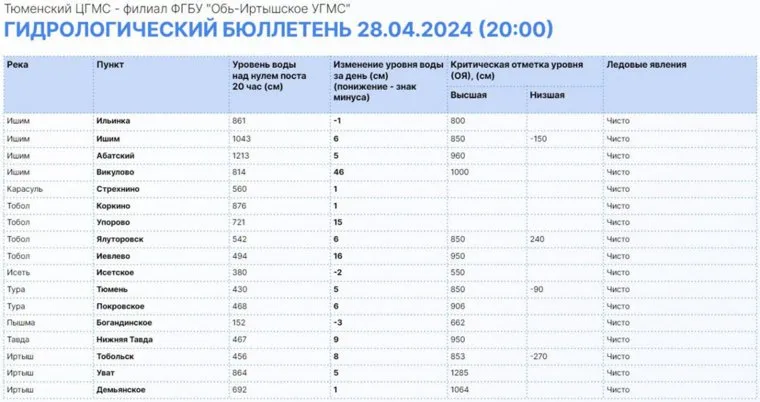 Уровень воды в городе Ишиме — 1043 сантиметра. Прирост за день составил шесть сантиметров. В Викулово — 814, с подъемом на 46 сантиметров.