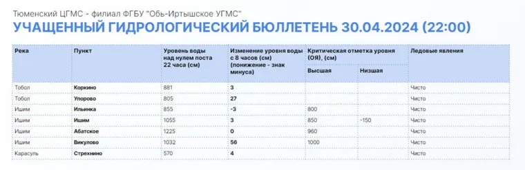 «Гидрологический бюллетень за 30 апреля, 22:00. Уровень воды в реке Ишим, гидропост Викулово: прирост с 8:00 на 56 см, уровень воды над нулем поста 1032 см, критический уровень 1000 см» — указано в сообщении.