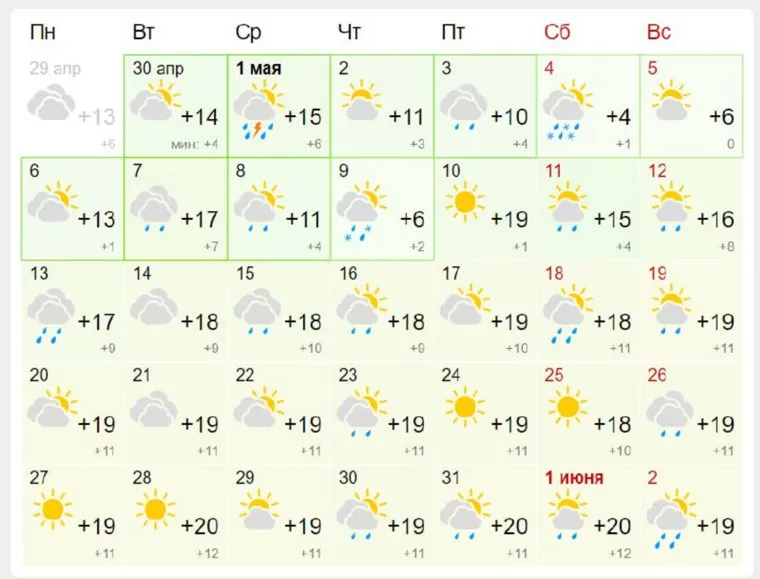 Похолодание ожидается и 5 мая. Осадков синоптики не обещают, но дневные температуры не поднимутся выше 6 градусов. Потепление в Челябинск придет с 10 мая. Дневные температуры установятся на уровне от 17 до 19 градусов тепла. Большинство дней будет пасмурными. 13 и 18 мая ожидаются сильные дожди.