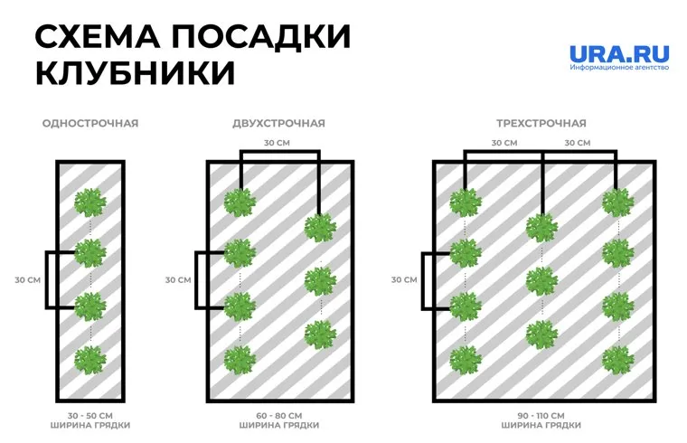 После стоит озадачиться выбором схем посадок ягод. Выбор которой зависит от предпочтений садовода и сорта клубники. Расстояние между кустами и рядами обычно варьируется от 25 до 40 см.