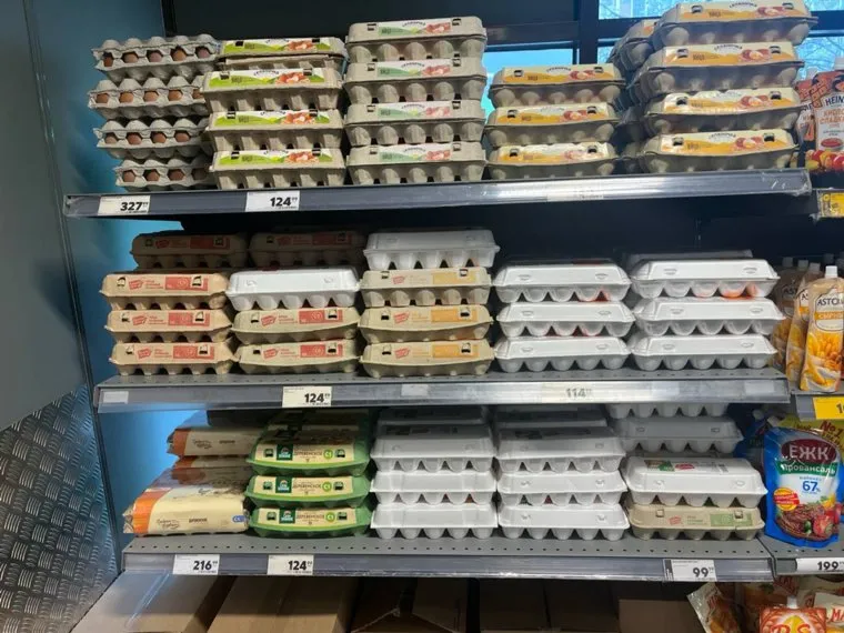Побольше ассортимент в магазине сети «Магнит», хотя и там полки полупустые. Цена за десяток яиц варьируется от 99,99 до 129,99 рубля.