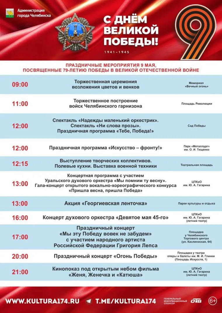 «Мероприятия на центральных площадках города пройдут 9 мая. Для челябинцев выступит народный артист РФ Григорий Лепс с концертной программой „Мы эту Победу вовек не забудем“», — сообщили в пресс-службе горадминистрации.
