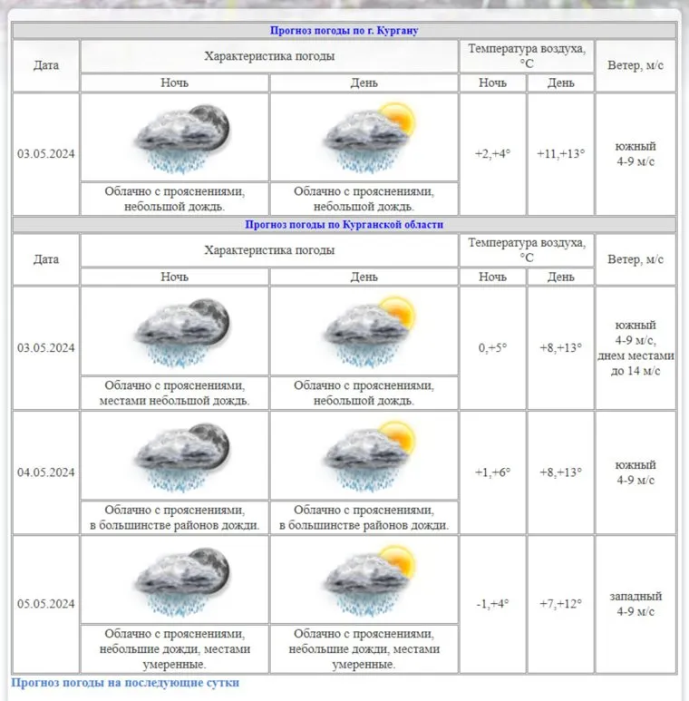«Днем и ночью 3 мая ожидаются осадки, местами небольшой дождь. Температура воздуха в дневное время будет до 13 градусов. Ночью прогнозируется нулевая температура. Местами ветер будет доходить до 14 метров в секунду», — указано на сайте Курганского ЦГМС.