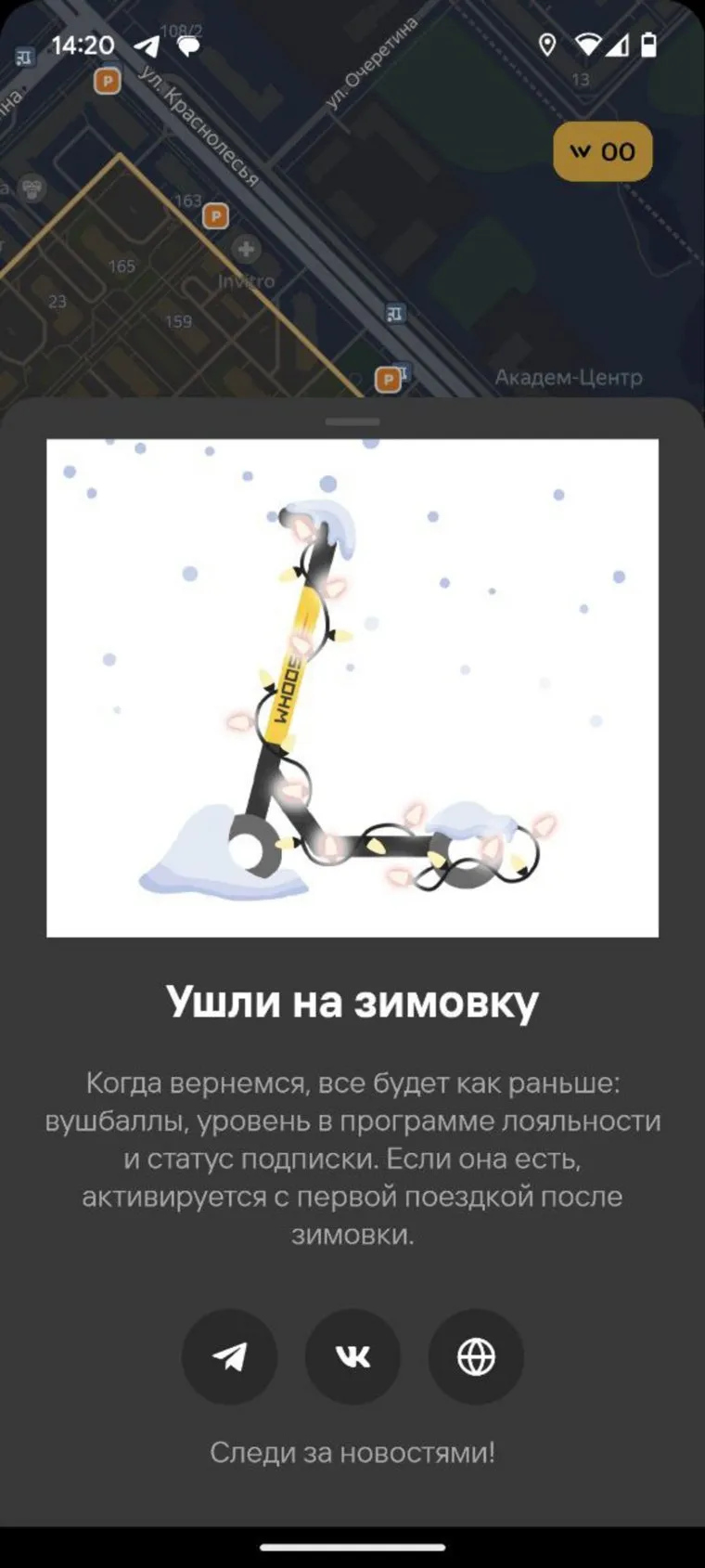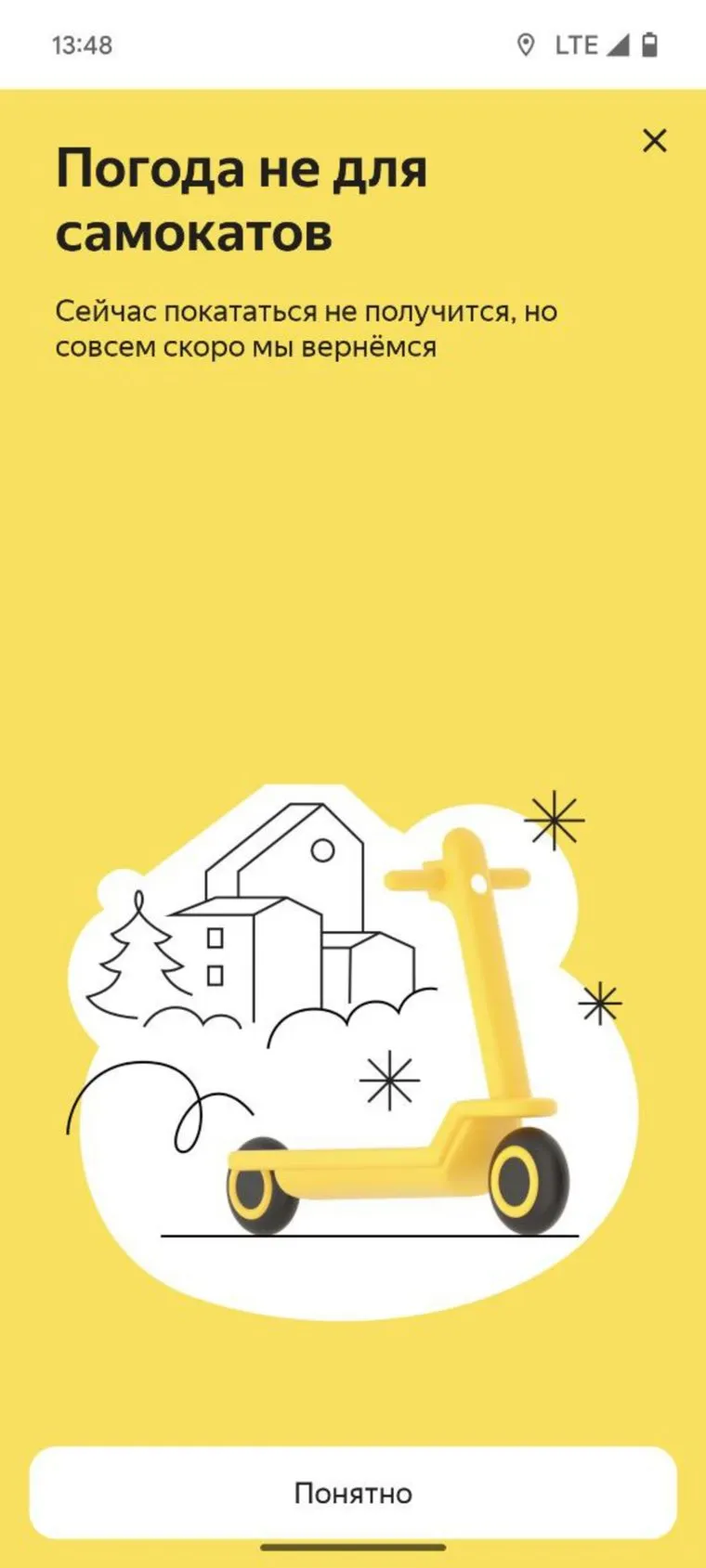 «Погода не для самокатов. Сейчас покататься не получится, но совсем скоро мы вернемся», — такая надпись появляется при попытке арендовать самокат в приложении «ЯндексGo». В сервисе Whoosh говорится, что самокаты «ушли на зимовку».