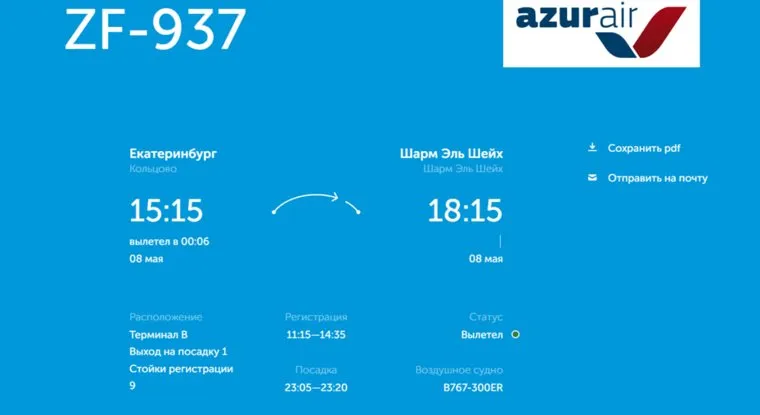 Вылет рейса ZF-937 Екатеринбург — Шарм Эль Шейх авиакомпании Azur Air должен был состоятся 7 мая в 15:15 по местному времени. Однако воздушное судно вылетело 8 мая в 00:06.