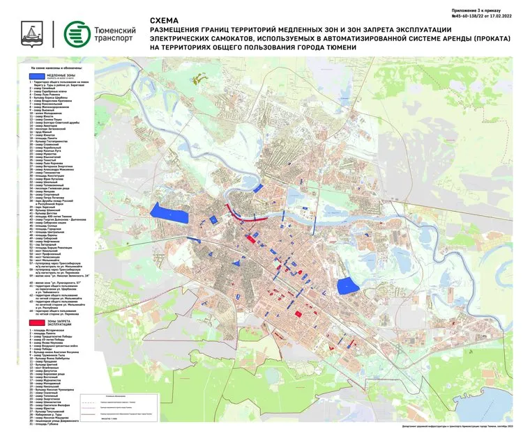 «Перечень границ территорий зон запрета эксплуатации электрических самокатов, используемых в автоматизированной системе аренды, на территориях общего пользования города Тюмени. Перечень границ территорий, обозначенных знаками 3.35 «Движение на средствах индивидуальной мобильности запрещено — набережная реки Туры», — указано в документе.