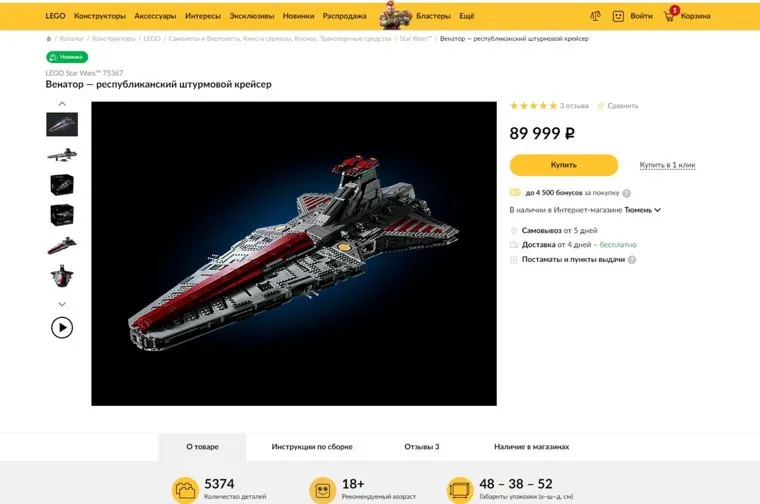 «Конструктор Lego „Венатор“ — республиканский штурмовой крейсер. Стоимость: 89 999 рублей», — указано на сайте магазина. В конструкторе больше пяти тысячи деталей. Он создан на основе вселенной «Звездные войны».