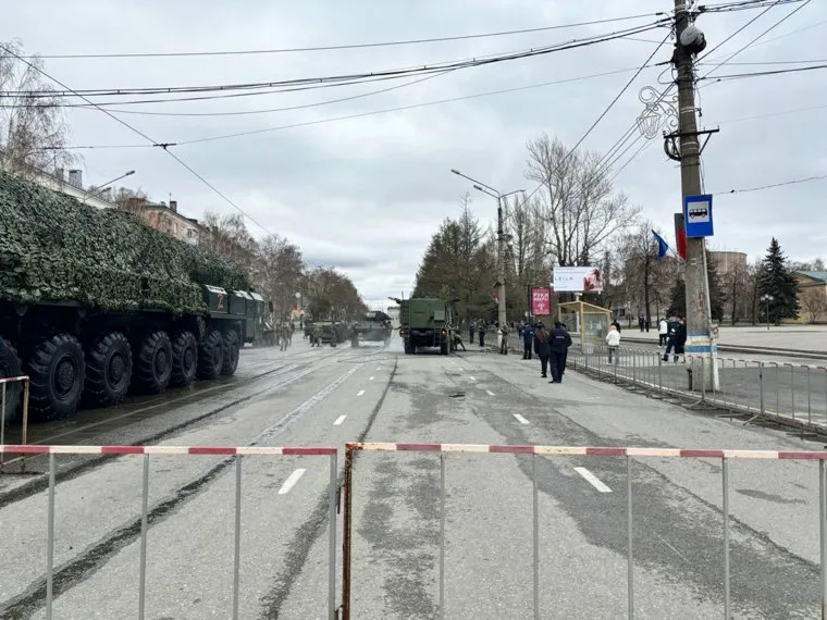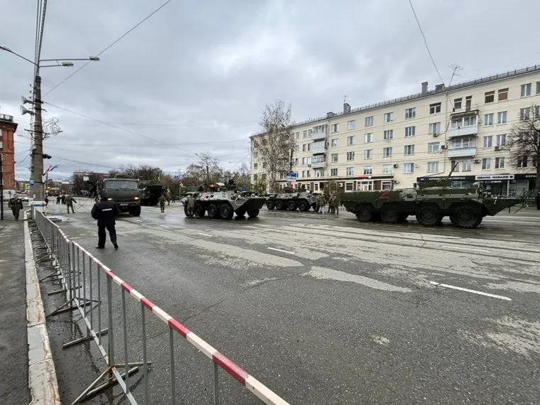 08:39 Движение в центре ограничили не только для автомобилистов, но и пешеходов. Людей не пускают там, где проходит военная техника, передает корреспондент URA.RU.