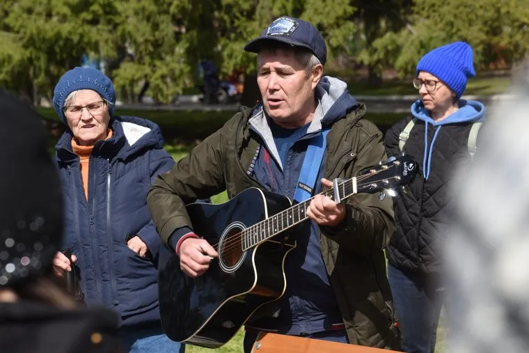 12:35 Екатеринбуржцы устроили импровизированный концерт на аллее в ЦПКиО. Зрителям выдают текст песен, чтобы они могли подпевать военные песни, передает журналист агентства.