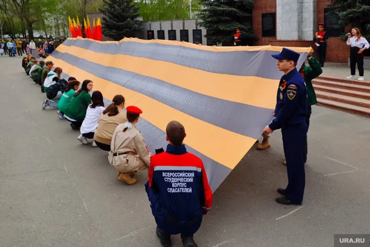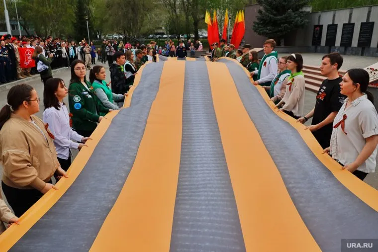 В канун 9 Мая в Кургане развернули 15-метровую георгиевскую ленту. При этом горожане хором исполняли песню «День Победы». Об этом сообщил корреспондент URA.RU, который посетил патриотическую акцию.