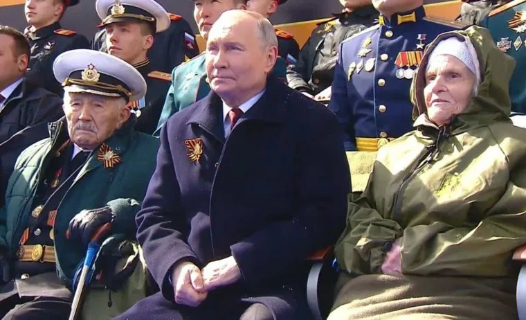 С одной стороны от Путина — фронтовик, полковник Евгений Куропатков, участвовавший в Параде Победы в 1945 году. В июле 2024 года ему исполнится 101 год. По другую руку от президента — снайпер Александра Алешина. Когда началась война, ей было 17 лет.