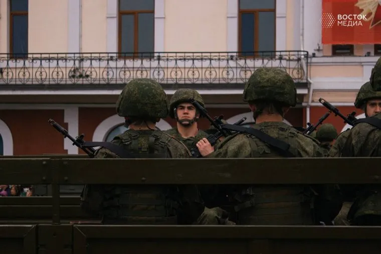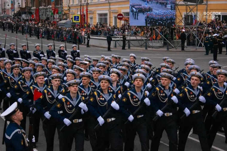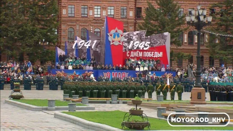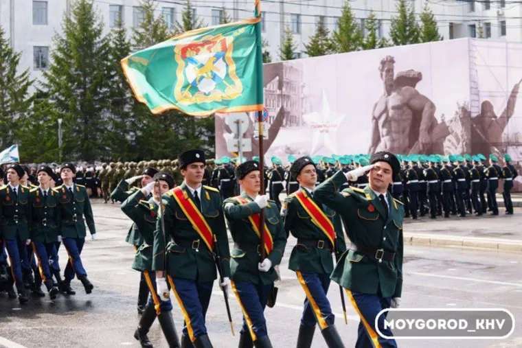 В пешем марше приняли участие около 2700 человек. В праздничной колонне прошли расчеты Восточного военного округа, сотрудники силовых структур, спасатели, кадеты, курсанты военных училищ, юнармейцы, ученики школы МЧС.