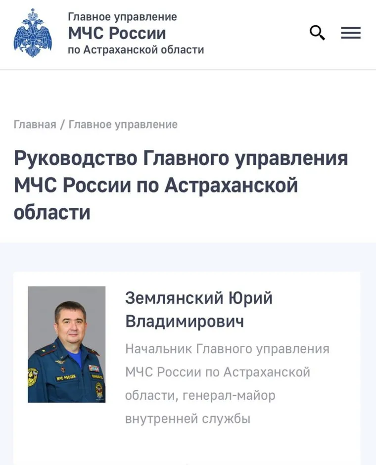 «Руководство главного управления МЧС России по Курганской области. Начальник ГУ МЧС по Астраханской области, генерал-майор внутренней службы Юрий Землянский», — указано на сайте МЧС Астраханской области. По данным корреспондента URA.RU, соответствующая информация на сайте о нем появилась 7 мая.