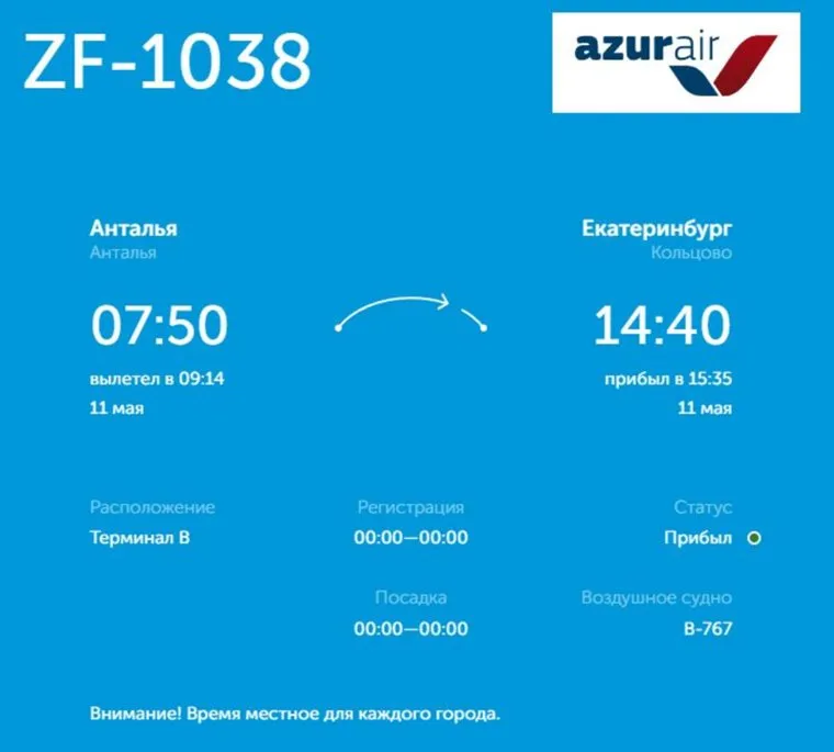 Рейс ZF-1038 авиакомпании Azur Air вылетел из Антальи в 09:14 и должен был прилететь в Екатеринбург в 14:40 по местному времени. Однако его прибытие было задержано до 15:35. Корреспондент URA.RU обратился в пресс-службу авиакомпании. На момент публикации новости ответ получить не удалось.