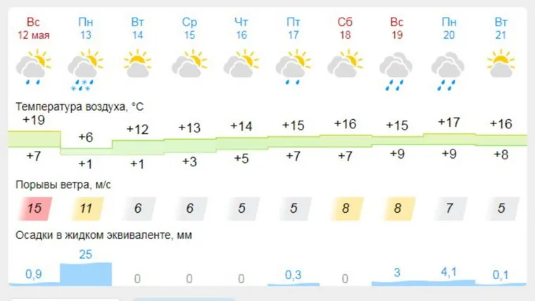 «13 мая ожидается сильный снег с дождем. Температура днем +6 градусов, в ночь на 14 мая — один градус выше нуля», — отмечается в долгосрочном прогнозе на сайте «Гисметео».