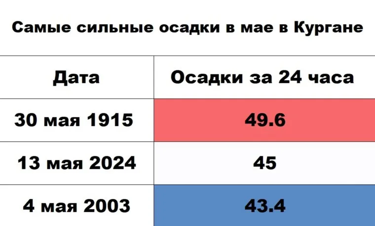 «Прошедший майский дождь стал самым сильным в Кургане за 109 лет. Этот дождь оказался вторым по силе за всю историю наблюдений в мае. Абсолютный суточный максимум был зафиксирован 30 мая 1915 года (49.6 мм)», — говорится в прогнозе синоптика в группе «Погода 45 — погода в Кургане».