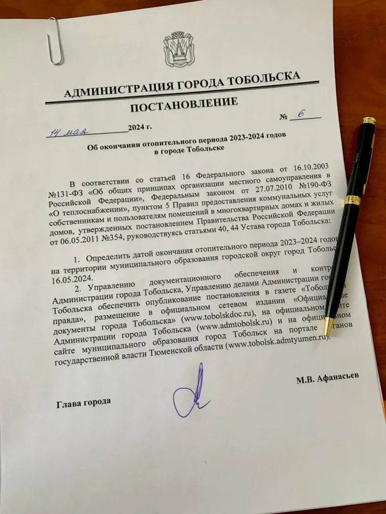 «Подписал постановление об окончании отопительного сезона с 16 мая», — сообщил Афанасьев. К сообщению он прикрепил фото подписанного документа.