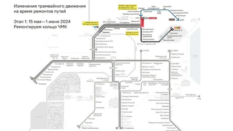- Трамваем-челноком «ЧМК — ЦХП», который будет ходить каждые 25 минут ежедневно.