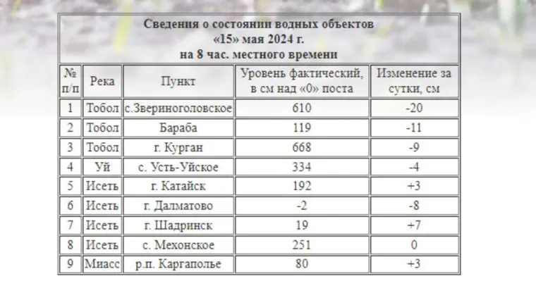 «В селе Звериноголовское уровень воды в Тоболе снизился на 20 сантиметров и составляет 610 см. В районе Барабы показатель уменьшился на 11 сантиметров и достиг отметки в 119 см. В городе Курган уровень воды также упал на 9 сантиметров, составив 668 см», — передает Курганский ЦГМС.