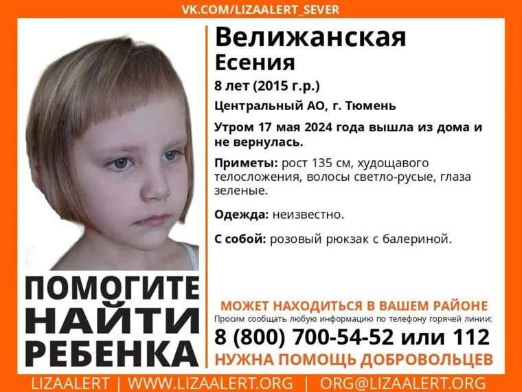 В Тюмени пропала 8-летняя Есения Велижанская. Информацию о пропаже ребенка разместил у себя в соцсетях поисковый отряд «Лиза Алерт». Девочка пропала утром из дома.