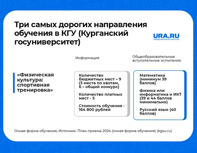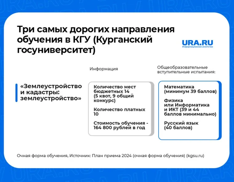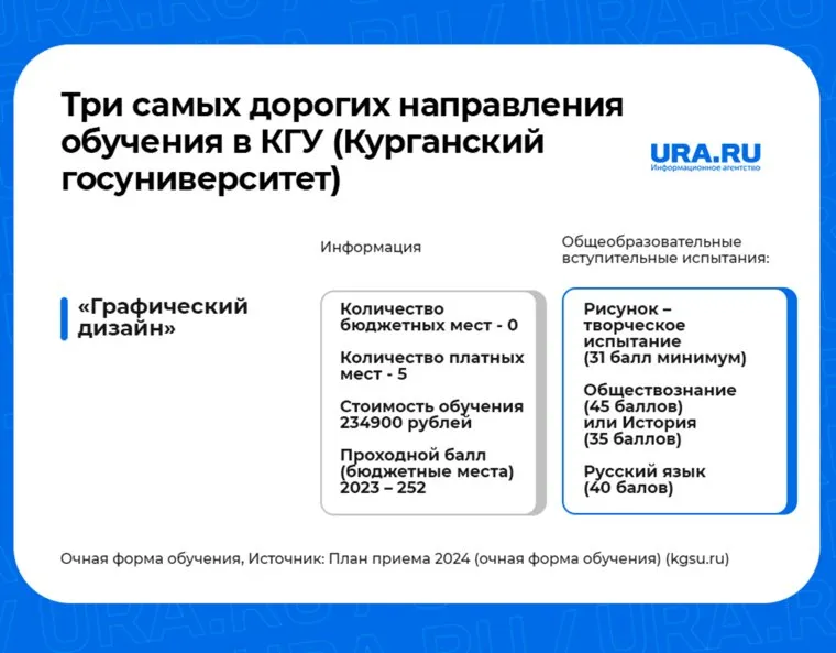 Курганский государственный университет опубликовал план приема абитуриентов на бюджетные и коммерческие места, а также стоимость платных образовательных услуг в 2024 году. Самым дорогим оказалось обучение по профилю «Графический дизайн». Какие направления на очной форме обучения дороже других и какой проходной балл нужно набрать – в материале и карточках URA.RU.