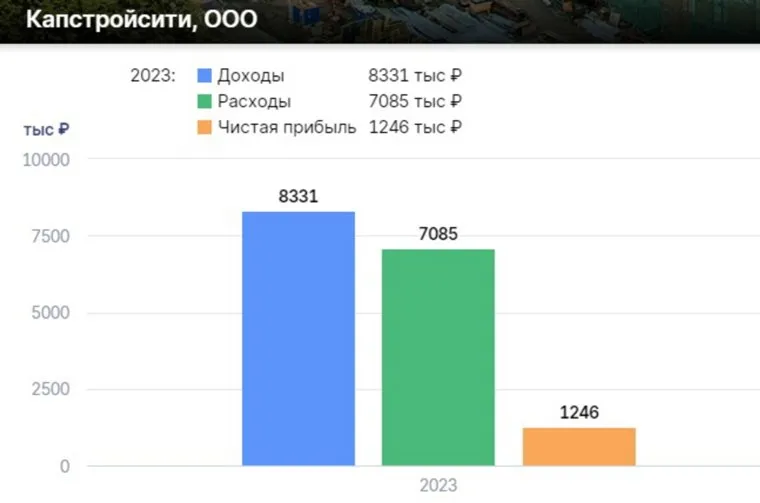 «Доходы ООО «Капстройсити» (г. Сочи) в 2023 году: 8,3 млн рублей. Чистая прибыль: 1,2 млн рублей», — указано в отчетности предприятия, опубликованной на сервисе СБИС.