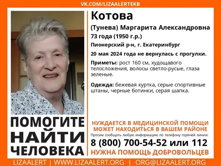 «Внимание! Помогите найти человека! Пропала Котова Маргарита Александровна, 73 года. 20 мая 2024 года не вернулась с прогулки. Нуждается в медицинской помощи. Может находиться в вашем районе», — сказано в посте в группе «Вконтакте» поискового отряда.