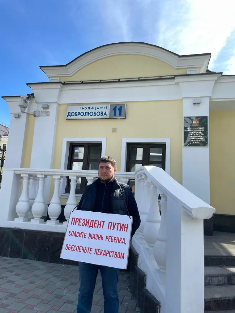 Дмитрий Бахтин, отец трехлетнего Миши со СМА (спинально мышечная атрофия), устроил одиночный пикет на улице Добролюбова, 11. Мужчина требует обеспечить своего сына препаратом «Рисдиплам». Об этом URA.RU рассказала юрист семьи Юлия Липинская.