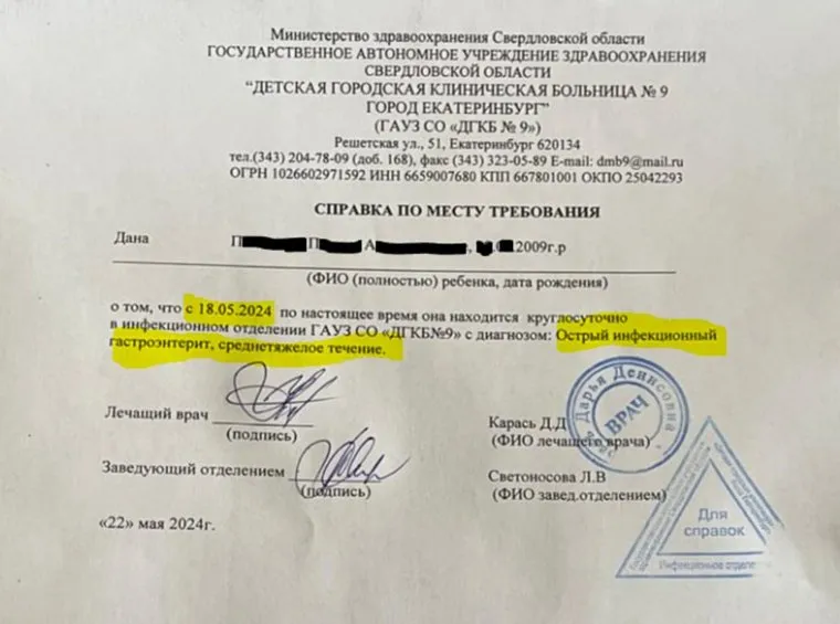 Утром 18 мая у девочки температура поднялась уже до 40 градусов, ее увезли в больницу, где сразу же положили в инфекционное отделение и начали ставить капельницы. «К ребенку нас не пускают, но врачи прислали справку, где указан диагноз острый инфекционный гастроэнтерит, течение болезни — среднетяжелое. Я отправил в „Жизньмарт“ досудебную претензию и заявление в Роспотребнадзор», — заявил собеседник.