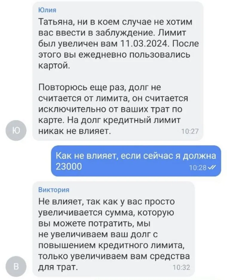 Поддержка банка пыталась убедить клиентку, что увеличенный лимит не влияет на сумму долга