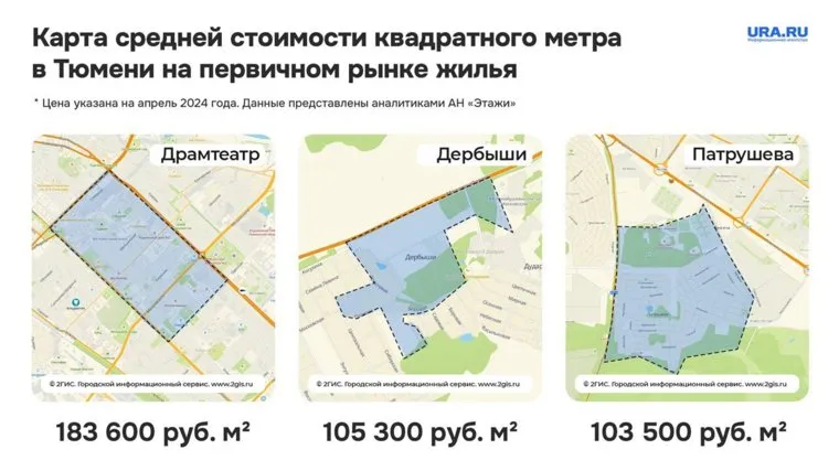 «Средняя цена предложения за квадратный метр в апреле 2024 года. Район Патрушева — 103 551 рубль, Дербыши — 105 308 рублей, Ново-Патрушева — 106 536 рублей», — указано в отчете риелторов.