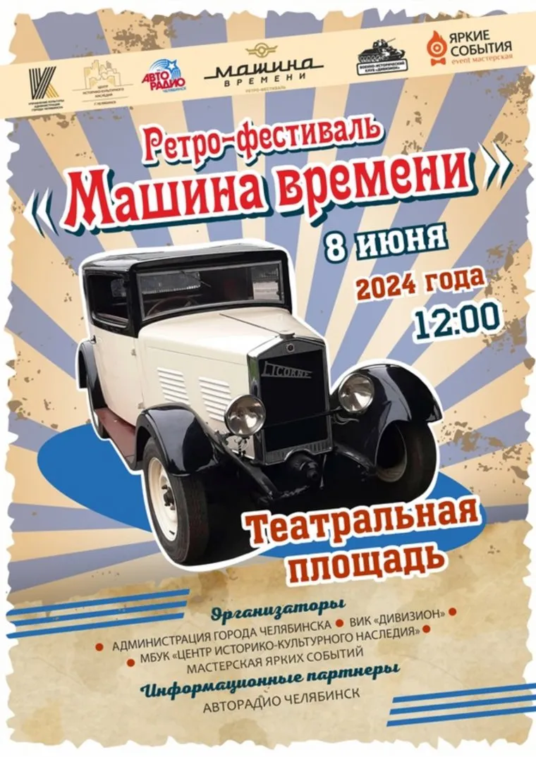 «8 июня в 12:00 пройдет фестиваль „Машина времени“. Более 100 единиц ретро-техники представят на Театральной площади. В программе: ведущий, выступления творческих коллективов и десять номинаций для ретролюбителей с призами и подарками», — сообщили в официальной группе «РЕТРОАВТО Челябинск» в соцсети «ВКонтакте».