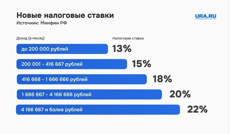 В пресс-службе Минфина РФ пояснили, что при доходе до 200 тысяч рублей сохраняется ставка 13%. В случае дохода с 2,4 млн до 5 млн рублей, она становится 15%. От 5 млн до 20 млн рублей — 18%, а от 20 до 50 млн рублей — 20%. Ставка при доходе свыше 50 млн рублей составит 22%.