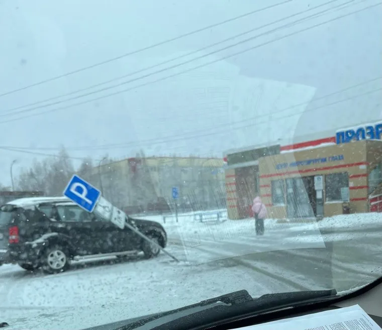 Дорожный знак упал на парковке в Ноябрьске из-за ветра