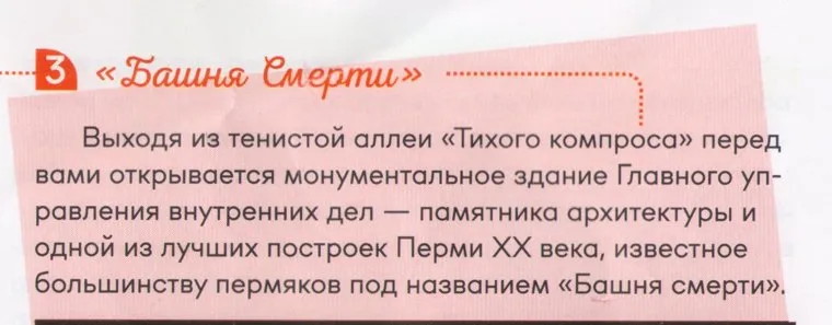 Макет брошюры также размещен на официальной странице администрации Перми в соцсети «ВКонтакте». «Вы увидите один из самых красивых зданий в городе…», — написано в нем о доме Мешкова. Еще одна ошибка: «Выходя из тенистой аллеи „Тихого компроса“ перед вами открывается монументальное здание Главного управления внутренних дел». «Сердцем» Перми авторы путеводителя называют и Соборную площадь, и сквер около театра оперы и балета.