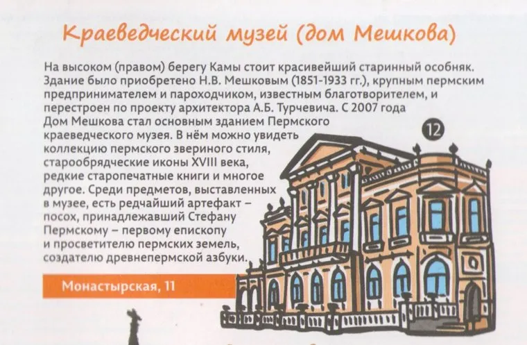 Администрация Перми выпустила для туристов два буклета-путеводителя. Они бесплатно распространяются в аэропорту, на вокзалах, а также в гостиницах и музеях. Но внимательные пермяки заметили, что издания изобилуют как лексическими, так и географическими ошибками. Например, дом Мешкова, который расположен на улице Монастырской на левом берегу реки Камы, в путеводителе оказался на правом берегу, отмечает блогер и путешественник Наталья Аксентьева.