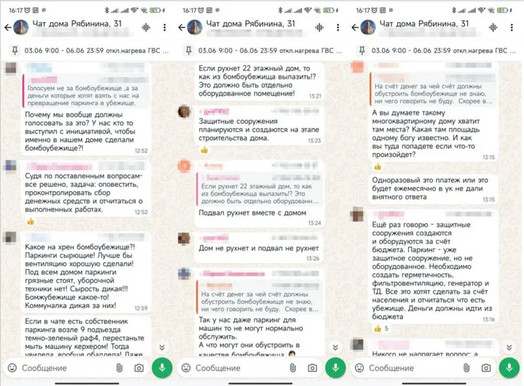 В чате жильцы не понимают, почему должны голосовать за это. Кто-то настроен категорически против того, чтобы в подвале их дома прятались люди, другие пытаются выяснить, за чей счет оборудуют помещения, третьи опасаются, как бы подвал не рухнул вместе с домом. При этом жители жалуются на сырость и грязь. «Паркинги сырющие! Лучше бы сделали хорошую вентиляцию! Под всем домом паркинги грязные! Какое бомбоубежище?» — недоумевают горожане.