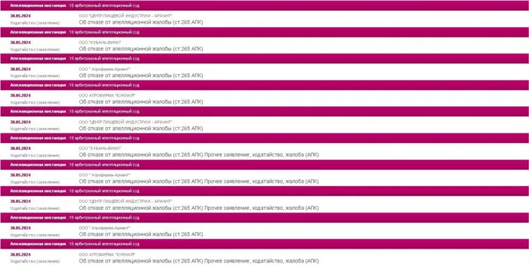 Апелляционные жалобы ООО «Центр пищевой индустрии-Ариант», ООО «Кубань-Вино», ООО «Агрофирма Ариант», ООО Агрофирма «Южная», ООО «Группа компаний Ариант» на решение Арбитражного суда Челябинской области от 5 апреля были приняты к производству Восемнадцатым арбитражным апелляционным судом в Перми 16 мая. Одновременно данное решение обжаловали и экс-владельцы группы ЧЭМК, Юрий и Людмила Антиповы. Рассмотрение их было назначено на 31 мая, но предприятия группы компаний «Ариант» отозвали свои заявления накануне.