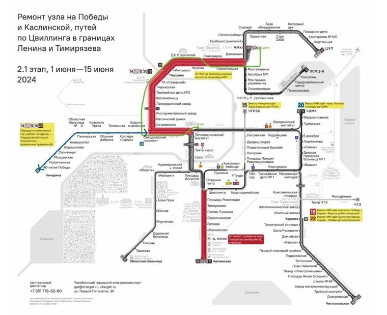 «С 1 июня по 15 июля будет ограничено движение на пересечении проспекта Победы с улицей Каслинской, по улице Черкасской на участке от улицы Аральской до шоссе Металлургов, по Свердловскому тракту от трамвайного Депо № 2 до моста через реку Миасс по улице Черкасской. С 1 по 30 июня будет ограничено движение по улице Цвиллинга от Тимирязева до проспекта Ленина», — сообщили в пресс-службе.