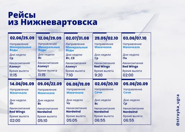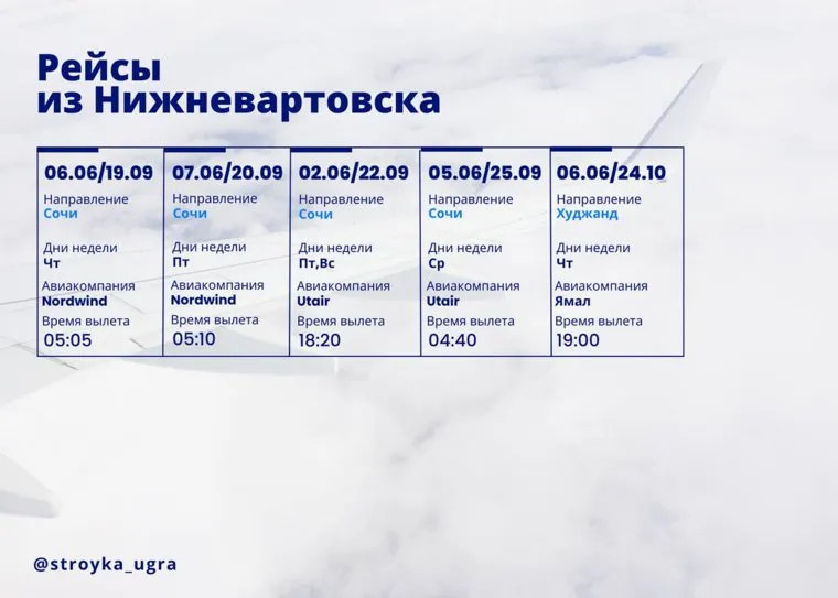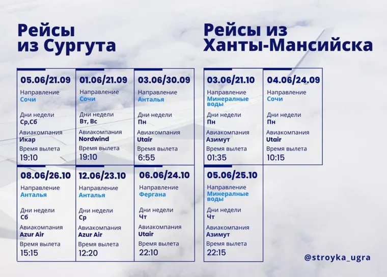 «Аэропорты Югры вместе с авиаперевозчиками проделали большую работу и предлагают югорчанам новые регулярные „летние“ рейсы на южных направлениях. Они запустили рейсы из Сургута в Сочи, Анталью, Фергану, из Нижневартовска в Минеральные Воды, Махачкалу, Сочи, Худжанд, из Ханты-Мансийска в Минеральные Воды и в Сочи», — сообщил telegram-канал Стройкомплекса Югры.