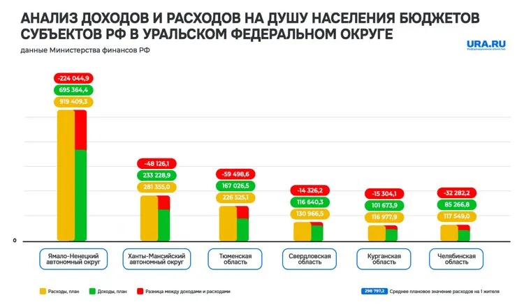 По данному показателю Ямал уступает только Чукотке, где доходность на душу населения определена в размере 968 тысяч рублей, расходы — в 1,1 млн рублей. Разница незначительна — 178 тысяч рублей.
