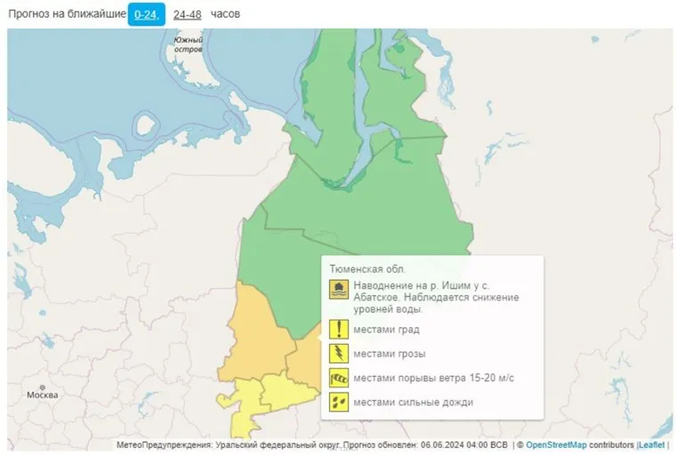 «Прогностическая карта предупреждений по Уральскому ФО. В Тюменской области в ближайшие 24 часа ожидаются опасные погодные явления: сильные дожди, местами грозы и град, сила ветра до 20 метров в секунду», — говорится на сайте учреждения.