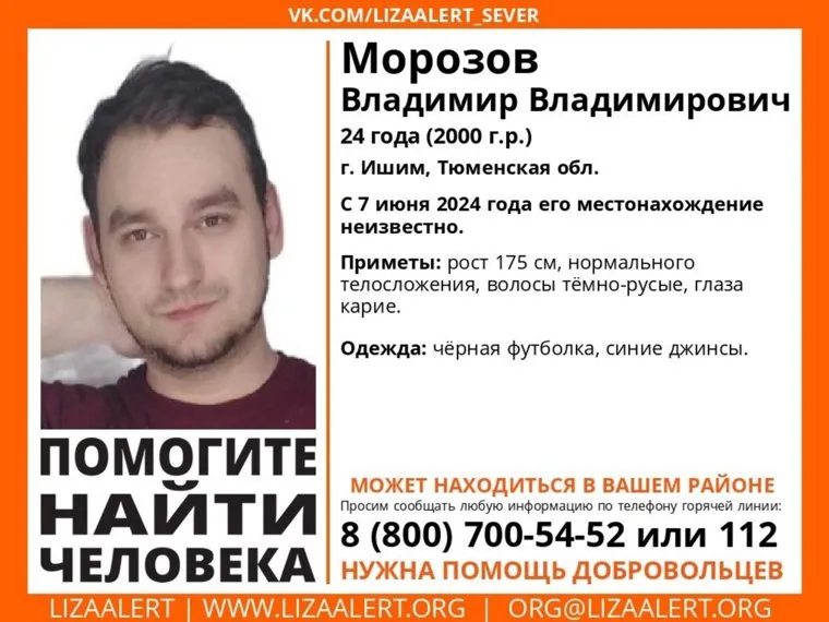 «Пропал 24-летний Владимир Морозов. Его ищут в Ишиме. С 7 июня его местонахождение неизвестно», — написал поисковый отряд в группе во «ВКонтакте».