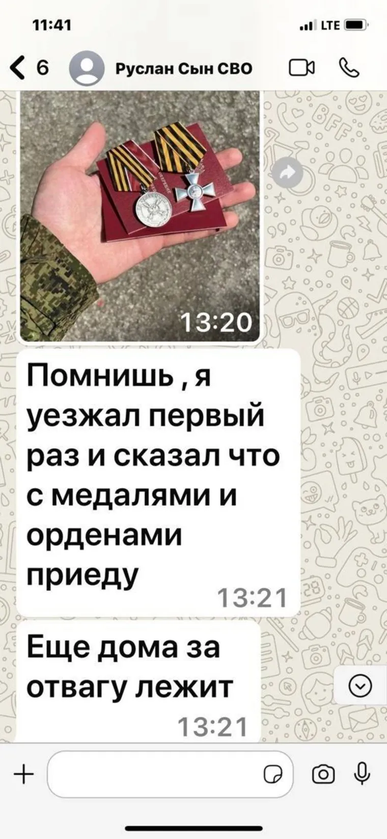 «Мой старший сын, Руслан в числе таких же отважных и истинных патриотов-ребят защищает Отечество. Нет, не за деньги. За преданность родине, за верность памяти героических предков, за мир. Искалеченный, с серьезными травмами и глубокими шрамами в сердце, Руслан трижды был представлен к высоким и заслуженным государственным наградам: знаку отличия ордена Святого Георгия Георгиевскому Кресту IV степени, медалям за „Храбрость“ II степени и „За отвагу“» — написал советник губернатора на странице во «ВКонтакте».