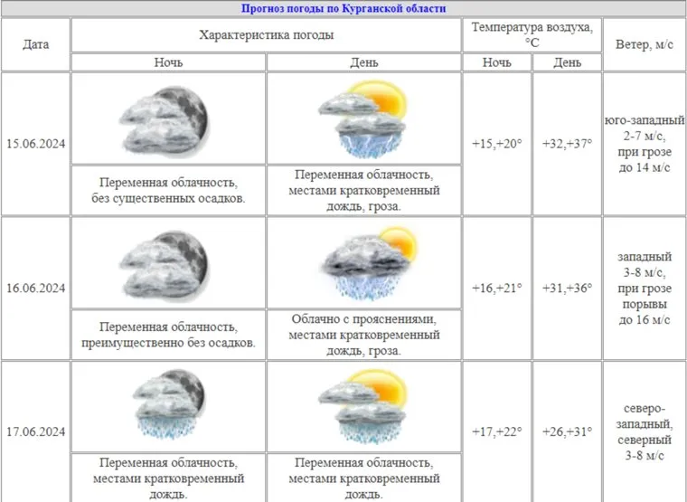 «Прогноз погоды по Курганской области на 15 и 16 июня. Переменная облачность, местами кратковременный дождь, гроза. Ветер до 16 метров в секунду», — указано на сайте ведомства. Дневные температуры составят +31, +37 градусов.